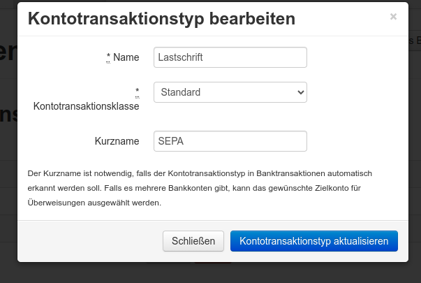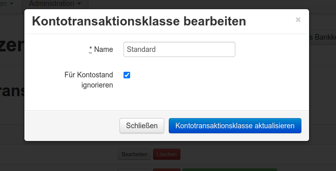 Zahlungsart ist ein Dropdown aus den vorhandenen Finanztransaktionsklassen.