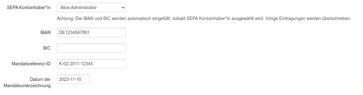 Diese kann aus den vorhandenen Mitgliedern gewählt werden. Die BIC und IBAN werden, so das Mitglied sie eingetragen hat, automatisch in das Form eingefügt: